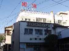公衆浴場「鷲温泉」の向こうに「太宰治執筆の宿旅館明治」が見える。