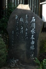 石川啄木(一(はじめ)・1886〜1912)は、明治41年(1908年)5月、北海道の放浪から創作生活に入るため上京し、赤心館 (オルガノ工場内・現本郷5ノ5ノ6)に下宿した。小説5篇を執筆したが、売込みに失敗、収入の道なく、短歌を作ってその苦しみをまぎらした。前の歌碑の「東海の………」の歌は、この時の歌である。