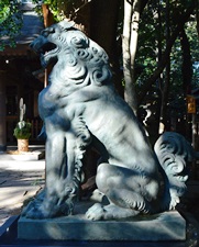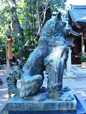 軒昂の気に溢れ、人間の表情をもち、首をややかしげた上体と、強固な旨から下部への構想、古来狛犬の名作は多いが、儀軌にとらわれない自由な想像による呼気吸気とが一体をなす霊獣と伝えられるこの狛犬は、まさに激動の昭和期が生んだ傑作であります。
