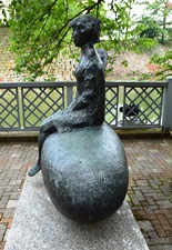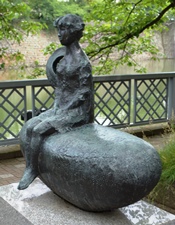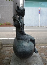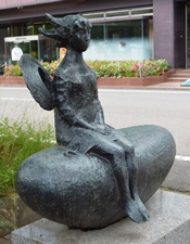福井城址御本城橋東植栽帯に「記念撮影−風と−」の像があった。