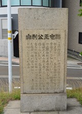 この附近は、かの明治政府初代の財政担当官として、又五箇條の御誓文の起案者として知られている、福井藩出身の逸材由利公正の宅跡である。彼は在藩時代三岡八郎と称して、ここに居を構えていたが、幕末維新の大立者坂本竜馬が福井藩の賓師として名声のあった横井小楠が彼を訪ねて、ここに足跡を印したことがある。 |