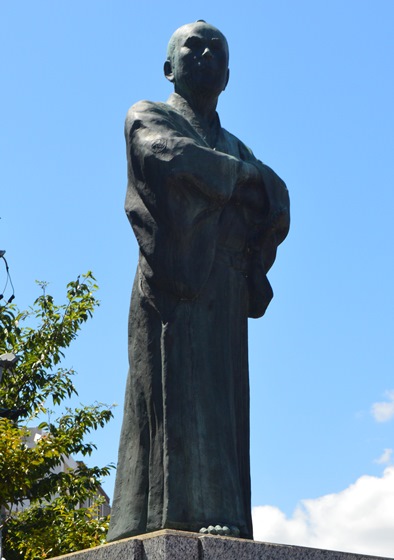 文久3年(1863年)5月、坂本龍馬は神戸海軍塾資金調達の為福井に来た際に、ここ由利公正(三岡八郎)宅跡へ夜半にも関わらず、幸橋(文久2年架橋)を横目に小船に棹さして福井藩政治顧問・横井小楠と共に訪れた。 そこで、肝胆相照らす仲となり福井藩の挙藩上洛の話や、ニッポンの洗たくの話など熱い想いを歌に託し、この地にて謡ったと伝わっています。 |