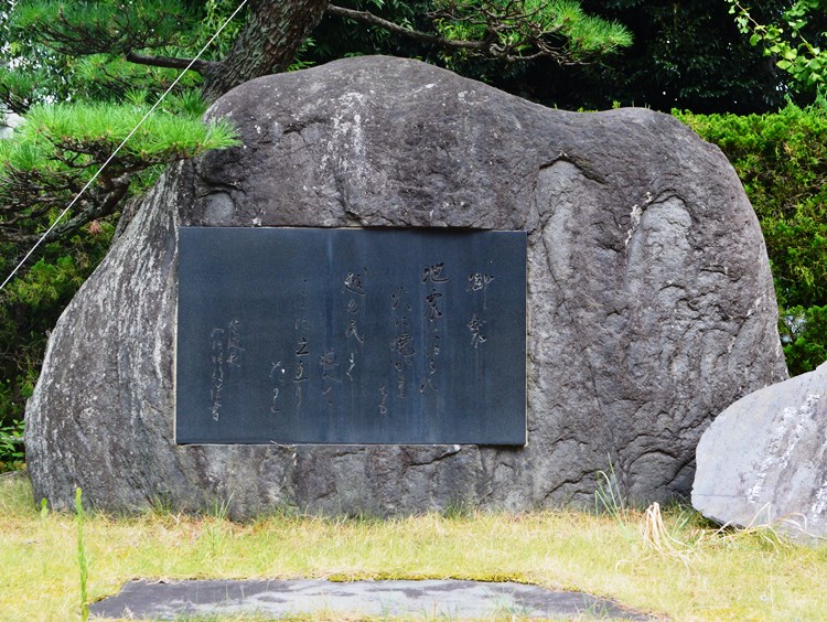 | この御製は、度重なる災厄を克服して雄々しく立ち上がった福井人の精進に思いを寄せられたお歌」であり、この石碑は天皇陛下御在位60年を慶賀し併せて福井市の大いなる飛躍を期するフェニックスプラザの完成を記念して建立したものである。 |