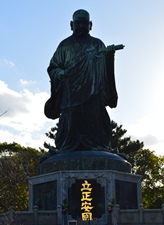 日蓮聖人は、文応元年(1260年)『立正安国論』を記し、当時の鎌倉幕府執権北条時頼にいち早く元(モンゴル)軍の襲来を警告しました。明治37年(1904年)に完成したこの銅像は、高さ10.55メートル、重さ74.25トン。8角形の台座には「立正安国」の文字と、日蓮聖人の一代記を描いたレリーフがはめ込まれています。この像の木製原型は、当時東京美術学校の教授で彫刻家竹内久一(たけのうちきゅういち)、レリーフの原画は洋画家矢田一嘯により作製されました。 |