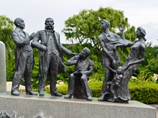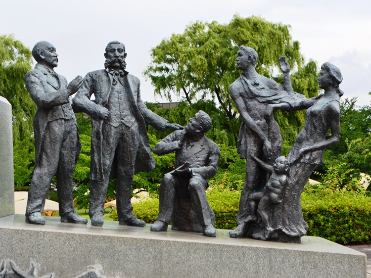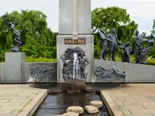 かつて奥州路の小宿場に過ぎなかった郡山は、明治の初期、この地の富商らが結成した開成社と、士族授産を目的とした明治政府直轄の大規模開拓により、太古以来の安積原野がことごとく開拓された。さらに明治15年、有史以来初めて猪苗代湖水をこの原野に東注した安積疏水の完成は、今日の郡山市発展の原動力となった。 われらは、この地に開拓精神発揚のシンボルとして、「開拓者の群像」を設置し、先人に感謝しその偉業をたたえ、これを後世に伝えるものである。