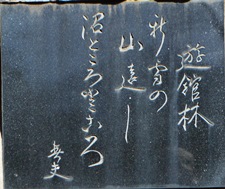 佐藤春夫 大正・昭和の小説家、詩人。明治25年(1892年)和歌山県東牟婁郡新宮町(現・新宮市船町)に生まれる。明治43年(1910年)に上京して生田長江、与謝野鉄幹に師事し、抒情的な文語定型詩や小品を雑誌「スバル」「三田文学」等に発表。『田園の憂鬱』で作家としてその位置を固める。以後、小説、詩集、評論など多くを著す。 昭和23年(1948年)日本芸術院会員。同35年(1960年)文化勲章受章。 昭和35年12月8日、県立館林高校の新校歌作詞のため館林に来遊し、『愚者の楽園』の一章に、碑文に因むその時の印象を発表する。翌36年(1961年)、再び館林の地を訪れ、『館林市外たたら沼』の詩を作る。 昭和39年(1964年)5月6日、心筋梗塞のため急逝する。72歳。京都の知恩院に葬られる。 平成3年(1991年)3月、建立。 |