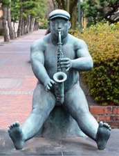 | ゆるやかな赤レンガ敷きの並木道に著名な作家による18点の彫刻が点在する。その内、ブロンズ像の写真である。 |