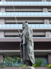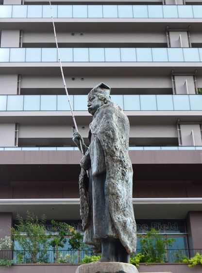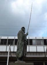 この五浦釣人像は、昭和50年山陽新幹線の開通と福山駅舎の落成を記念して本市の名誉市民平櫛田中先生のご厚情をうけて建立したものです。 田中翁の会心作といわれるこの像には、翁の生涯の師として崇拝された岡倉天心先生が、東京から五浦に移って、横山大観など多くの偉才を育てたことを釣りにたとえ、師に対する報恩の気持ちが込められています。 田中翁は、練達した彫技法による写実的な作風で田中芸術を開花させ、世界に誇る木彫の名匠として活躍されましたが、昭和54年に、108才で他界されました。