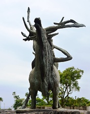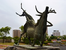 | このブロンズ像は、ギリシャ神話に由来するもので、エウローペ姫が天帝ゼウスの化身である牛の背に乗ったとき、急に起きあがった牛が、姫とともに渚から紺碧の地中海に飛び込もうとする、まさにその姿である。神話によれば、姫が牛に乗って歩いた地域はエウロバと呼ばれ、ヨーロッパ大陸名の起源となったのであるが、この姿は古くから永遠の発展を願うテーマとされている。 |