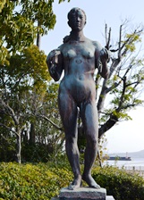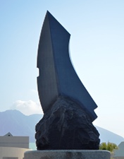 Kみかげが石を研ぎ出したシャープなかたちと自然の力強い割肌を対比させ、錦江湾の風をはらみながら陽光に映える帆をイメージした力量感溢れるモニュメントを意図した。