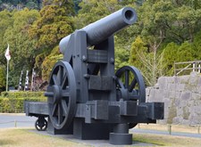 西欧列強が東アジアに進出した19世紀、28代島津斉彬は防衛のために西洋式の反射炉や溶鉱炉・鑚開台を建設し、鉄製大砲を製造しました。斉彬の側近市木四郎は、薩摩藩は安政4年(1857年)に鉄製150ポンド砲の製造に成功したと記しています。文久3年(1863年)、薩英戦争の時、鹿児島城下には2門の150ポンド砲があり、威力を発揮しました。 |