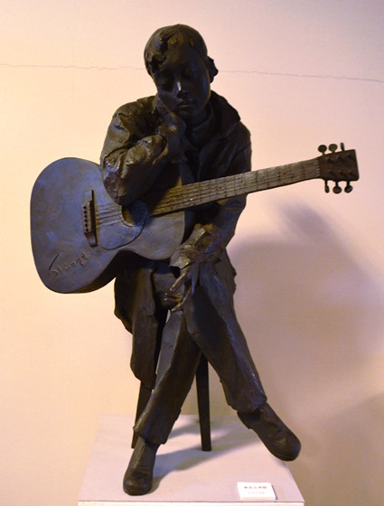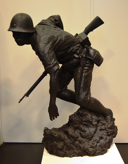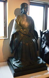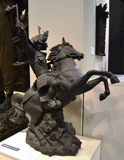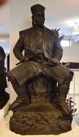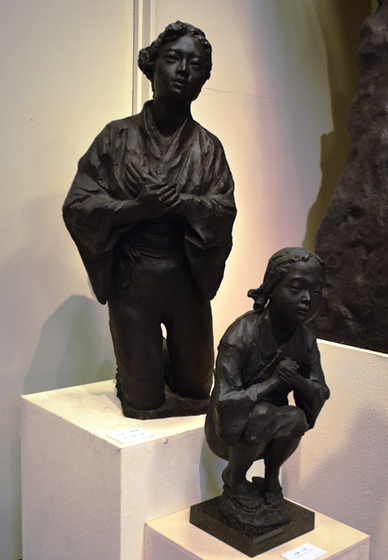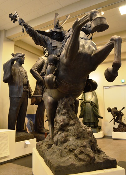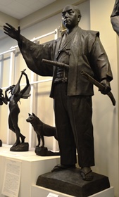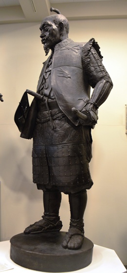 | “関ヶ原の戦い”で西軍(豊臣方)に付いた島津義弘公は、最後まで奮戦するうちに三方を東軍(徳川方)に囲まれ退路を断たれました。一時死を覚悟した義弘公ですが、家臣にいさめられ敵陣突破を敢行します。家康の本陣をかすめながらの突破に成功し「敗れても島津」と賞賛されました。制作に当たって関ヶ原の資料館を訪ねた中村は、合戦絵図に〇に十の旗印を見つけ、「自分もその中のひとりであるような錯覚におそわれた。」と言います。 |