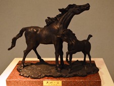 | 中村が馬の姿を求めて訪れた宮崎県の都井岬には、国の天然記念物に指定されている、日本在来種の一種である御崎馬が野生の状態で棲息しています。車の中から静かに馬の群れを見ていると、一頭の雄馬が親子の馬に近づいていきました。すると母馬は雄馬の側にゆっくり回り込んで、身を挺して仔馬を守るのでした。母馬の愛があふれる姿にしばし時を忘れてながめていました。中村晋也の干支「大地の愛」は、のどかな平原に憩う元気な仔馬と優しい母馬の様子に、平和で穏やかな日々の暮らしを願う作者の思いが込められています。 |