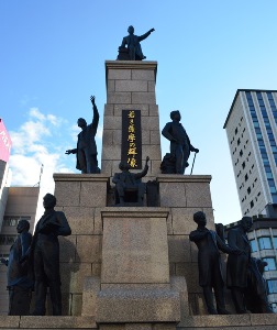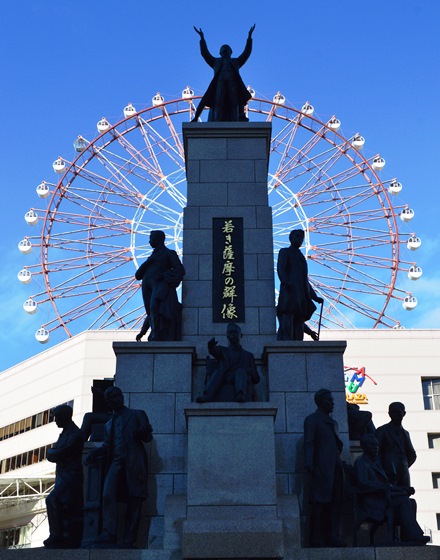 薩摩は明治維新など日本の近代化に有為の人材を輩出した誇り高き土地柄であり、現代の私たちにも先人の情熱が脈々として流れています。 この像は日本の開化期に大きな役割を果たした薩摩藩英国留学生を主題とした「若き薩摩の群像」です。 薩英戦争において西欧文明の偉大さを痛感させられた薩摩藩は、鎖国の禁を犯し、1865年、藩士17名の留学生を英国に派遣しました。 一行は、強靱な士魂と熱烈な郷土愛をもって異国における数々の障害を克服し、学問や技術を修め、帰朝後は、黎明日本の原動力となり各分野で不滅の業績を残しました。 わが鹿児島市が、今日50万都市達成の記念すべき時にあたり、私どもは、これらの偉業と、古来進取的であったわが郷土の気風に学び、あすの郷土の限りない発展を念じて、この像を建立したものです。 |