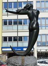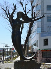 1963年3月、市制施行30周年を記念し、彫刻家の澤田政廣氏が制作した人魚像「海の讃歌」が、平塚駅北口ロータリーに設置された。 その後、1970年5月、平塚駅広場中央地下道開通に伴い現在の場所に移設された。 作者 澤田政廣(せいこう) 本名、澤田寅吉。1979年文化勲章受章。 1894年熱海町(現・熱海市)生まれ。19歳で彫刻家を志し、高村光雲の高弟、山本瑞雲に師事。東京美術学校彫刻科別科で朝倉文夫の指導を受ける。93歳で没するまで多くの木彫作品をはじめ彫刻・絵画・陶芸・書など、さまざまな芸術の領域にわたり創作した。 人魚は、澤田氏が生涯にわたりモチーフとした1つであり、本作「海の讃歌」をはじめ、デッサンや墨彩画などの作品が多く残っている。「海の讃歌」は熱海市立澤田政廣記念美術館にも常設されている。