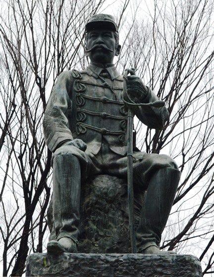 天保8年(1837年)土佐藩士の家に生まれ、戊辰戦争に参戦して功績があった。明治5年(1872年)陸軍少将となり、6年から暫く熊本鎮台司令長官となり、神風連の変後、再び熊本鎮台司令長官となり、西南戦争に際しては籠城策をとり、52日間にわたる薩軍の猛攻に堪えて勇名を馳せた。のち貴族院議員となり、同44年(1911年)に没した。 この銅像は、昭和12年(1937年)に西南戦争60年を記念して建設されたが、第二次世界大戦中に金属提供され、昭和44年(1969年)に明治100年を記念して再建された。朝倉文夫の作品である。