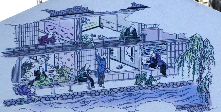 この絵図には高瀬川の両岸に三条、二条間で、江戸中期から栄えた池洲料理屋が描かれています。鯉、鮒、鰻などの川魚や鴨などを池洲や庭に飼っておいて生鮮な料理を提供し大変繁盛しました。京の人のみならず、観光客も楽しみました。酒は出しましたが、女人禁制で、琴・三味線等の音曲も禁止の男性だけの清遊の場でした。絵図の右端、板の間の向こうに池洲があり、魚が泳いでいる野が見えます。今もこの周辺には飲食店が軒を連ねていて、大いに賑わう生洲料理店の発祥の地です。