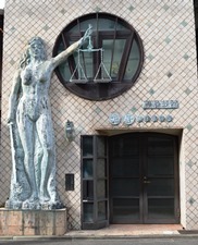 左手に掲げるハカリは、公平を象徴するとともに悪の重さをはかり、剣は、力による貫徹を象徴し、目隠しは、無私をあらわすものといわれています。