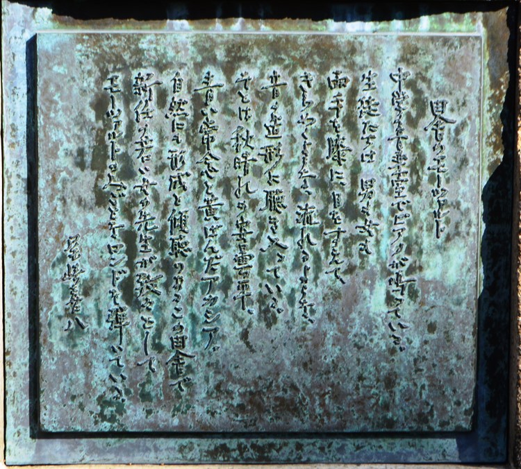 田舎のモーツァルト 中学の音楽室でピアノが鳴っている。 生徒たちは、男も女も、 両手を膝に、目をすえて、 きらめくような、流れるような、 音の造形に聴き入っている。 そとは秋晴れの安曇平、 青い常念と黄ばんだアカシア。 自然にも形成と傾聴のあるこの田舎で 新任の若い女の先生が孜々(しし)として モーツァルトのみごとなロンドを弾いている。 |