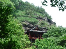 千曲川の岸に俄かにそびえ立つた斷崖の山(多分古代噴火口のあとかも知れません)です、昔西行法師がこの寺に三年とか宿つてゐた相です、その時に咏んだ歌といふのを見せて貰ひましたが法師のものらしくありませんけれどいかにも山の深い法師の好み相なお寺です、