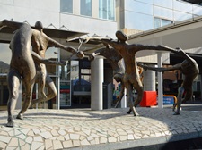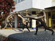 長野市制90周年のモニュメントで、5人の乙女が楽しく円舞曲を踊って、市の繁栄を祝っている姿です。マチスという画家は色彩感覚を大事にした人で、この作品を金色に塗った由来です。当初は4人にしたり、6人にしたり試行錯誤を繰り返したそうですが、5人としたのは、長野冬季五輪の招致運動が行われていた時で、その感動を願って決めたと作者は言っています。