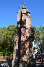 爆心地から北東へ約500mの小高い丘にあった浦上天主堂は、明治28年(1895年)から建築に着手し、信徒たちの献金と労働奉仕により、大正3年(1914年)に献堂式を挙げるにいたりました。大正14年(1925年)に正面の双塔が完成し、大小の鐘が吊されました。 東洋一の壮大さを誇った天主堂でしたが、昭和20年(1945年)8月9日、午前11時2分、原子爆弾のさく裂により破壊され、わずかにまわりの壁を残すのみとなりまた。 この側壁は聖堂の南側の一部で、昭和33年(1958年)に新しい天主堂建設のためこの地に移築されたものです。壁上の石像は、フランシスコ・ザビエルと使徒です。しかし、風雨にさらされて劣化が進行したことから、安全性を考慮して現在の形状のまま内部及び表面の補強を行ないました。 長崎市は、原爆で亡くなられた方々を追悼するとともに、二度とこのような惨禍が繰り返されないことを願って、この銘板を設置します。