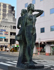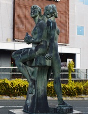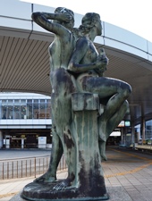 この作品は、昭和35年に学園前駅のシンボル像として建設致し、40年の歳月が過ぎました。当初は白色セメント像で風化が進み、学園前駅改良と商業ビル建設完了に際し、建立時の姿にするべく補修制作に精進を重ねてきました。