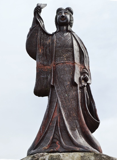 日本の三大悲恋物語といわれる松浦地方に伝わる伝説が、「松浦佐用姫」の物語です。古代、朝廷の命令で朝鮮半島の任那、百済の救援に派遣された青年武将大伴狭手彦は、停泊地である松浦の地で土地の長者の娘「佐用姫」と恋に落ちます。やがて、出帆の時が来て、別離の悲しみに耐えかねた佐用姫は鏡山に駆け登り、軍船にむかって身にまとっていた領巾を打振りました。それでも名残はつきず、佐用姫は山から飛び降り、呼子加部島まで追いすがったものの、すでに船の姿はなく、悲しみのあまり7日7晩泣き続け、ついに石に化したというものです。 この物語は、万葉の歌人たちにも数多く詠まれるものとなり、以後詩歌や能などの文学や演劇の題材にもなりました。 鏡山はこの故事から「領巾振山」と呼ばれるようになったといいます。 平成14年3月建立