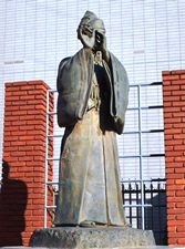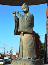 深谷市本住町の城址公園入口に「笛を吹く武者」の像があった。