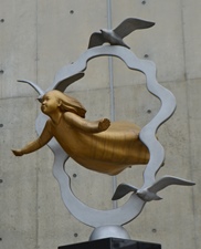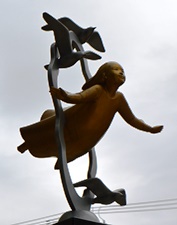 彫刻「大空」は、春日部市の鳥ユリカモメを題材として構想を練ったものです。併せて、市が標榜する「子育て日本一」にふさわしいものをと考え、少女が、ユリカモメに守られながら、大空を高く自由に飛んでいるイメージを表したものです。