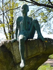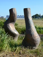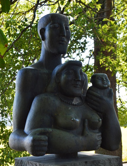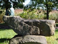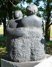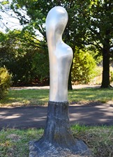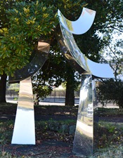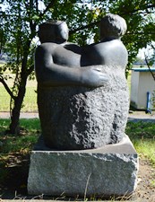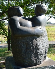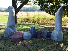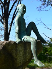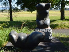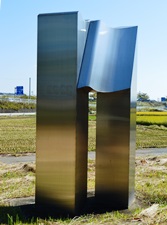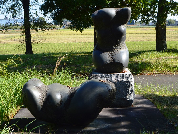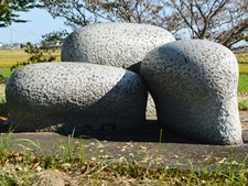 外形的には怪獣のネッシーのようです。 「モコ・モコ」という題が示すように、丸みをおびた石が12個のブロックで構成されており、種類は白・黒・赤の花崗岩と白い大理石を組み合わせています。 作品に触れたりして、親しみを感じ、自由に空想を育んでもらいたいと思いました。