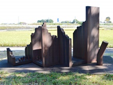 コリント地峡は、ギリシャのアテネとペロポネソス半島を結ぶ地点にあります。コリント地峡にかかる橋の中央に立って地峡を見た時、その壮大な空間に感動しました。そんな感動のイメージを再構成し、作品にしました。視点を変えて見ると、色々な景観を感得でき、また時間の経過に伴い、光や影の移り具合による季節感や空間の美しさが感じられるように表現しました。