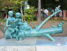 長沼依山の童話の本にちなんで、本の中に出てくる動物をけやきの木に配し少年少女は座ってその本を読んでいます。 |