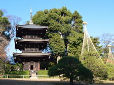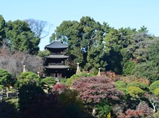 江戸時代、この地は黒田豊前守(上総久留里藩三万石、現・千葉県君津市)の下屋敷であった。その後、長州(山口県)出身、明治の元勲山県有朋(軍人・政治家)の屋敷となった。台地と谷の起伏を巧みに利用し、二段の池を配した庭の築構は明治30年(1897年)頃といわれている。この地は以前から椿が多く自生し、神田川を隔てた早稲田田圃を一望できる景色がすばらしく「椿山」と言われた。明治になって山県有朋によって「椿山荘」と命名され、天皇をはじめ多くの人々が訪れた。大正年間に藤田平太郎男爵の所有となり、各地からの文化財を随所に配した林泉廻遊式庭園として、さらに整備された。現在約5万uの広さがある。園内の三重塔は大正14年(1925年)広島県加茂郡河内町篁山竹林寺から移築し、一部改修したもので、室町時代末期の建立といわれている。 |