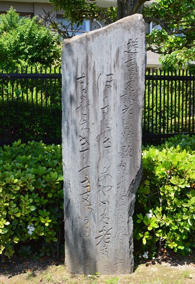 この碑には、明治から大正初期の宮内大臣、渡辺千秋が武蔵園に来遊して詠んだ和歌一首が刻まれています。 渡辺千秋(1843〜1921)は、天保14年(1843年)に信州高島藩士の子として生まれました。明治期に入ると鹿児島県令などを歴任したのち、明治25年(1892年)に内務次官となり、27年には貴族院議員に勅選され、さらに宮内大臣に任命されたのは明治43年(1910年)のことでした。こうして千秋は政府高官として活躍しましたが、その一方で『千秋歌集』を著すなど歌人としても著名な人で、彼の多彩な才能がしのばれます。 なお、この歌碑はもともとは明治35年(1902年)に武蔵園主吉木磯吉によって建てられたものですが、武蔵園が廃園となり、幾多の経緯を経て、平成24年(2012年)奥村敞氏から区へ寄贈され、現在に至っています。