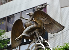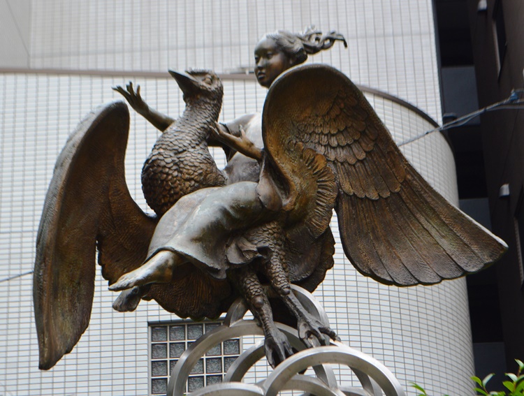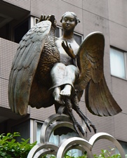 この地域一帯は、中世から開かれ、江戸時代からは網代町の名称のもとにさかえたところですが、先の大戦により一面が焼け野原になってしまいました。 戦後、戦災復興の区画整理事業が行われ、昭和24年、この網代公園が誕生しました。 「少女」「不死鳥」「波」「雲」で構成されるこのモニュメントは愛と夢、そして生命あるすべてのものとの共生と合歓を希求し、碧空に翔び立とうとする少女と不死鳥をあらわしたものです。 この公園の誕生が戦災復興という当時の人々の夢の結晶であったことを思い起こし、見る人に安らぎを与え、人と人との交流を広げることを願ってこのモニュメントを制作したものです。