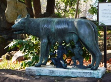 この彫像は、昭和13年(1938年)にイタリアから東京市に寄贈されたもので、ローマ建国の大業を成し遂げたロムルス、レムス兄弟の有名な伝説に基づいた像です。 幼い兄弟は、祖父を殺し王位を奪ったアムリウスによってチベル河に流されましたが、忽然と現れた一匹の牝狼に助けられ、その乳を飲んで成長し、成人した兄弟は祖父の仇を討ちローマを統一したと言われています。 |