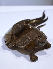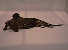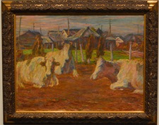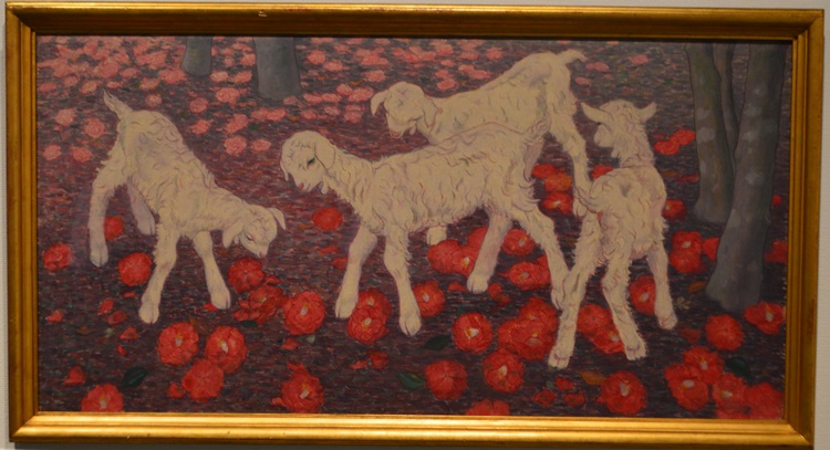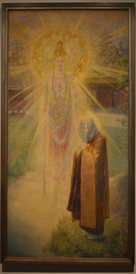 聖武天皇の皇后である光明皇后(701−760)は仏教への信仰深いことで知られ、伝説も少なくありません。この絵は、彼女が奈良の法華寺を建立する際に、池に観音の姿が映るのを見たという逸話に基づいています。ただし中沢は場面設定を一工夫して、現代の尼僧が、かつての光明皇后の遺徳をしのんでいる姿にしました。とはいえよく見ると、この尼僧の頭にも光輪があります。設定は現代でも、やはり光明皇后のイメージが重ねられているのでしょう。