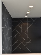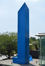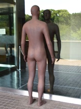 | 建物の内側と外側には、そっくりなかたちの人体像が向き合っています。設置場所は作者本人が決めました。この置かれ方だと、それぞれの人物を正面から鑑賞することはできません。像の全体を知覚するためには、向かいのもうひとりをガラス越しに観察する必要があります。しかし見る角度によっては、窓に反射したこちら側の虚像を見ているのか、あるいは向こう側の像を見ているのかがはっきりとせず、不思議な感覚に陥ります。 |