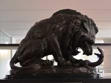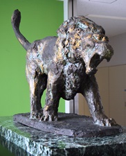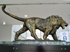 日本を代表する彫刻家で文化勲章受章者。 長崎市の平和記念公園の『平和祈念像』が有名である。 「密林之王者」は、89歳であられた1973年に製作された。百獣の王ライオンらしく、威風堂々とした体躯と風格を漂わせ、目標である獲物を狙う鋭さを表現している。 日本体育大学創立125周年を記念して国際自動車株式会社から寄贈された。日体大のシンボルであるライオン、学生たちに“夢”としてもつ獲物を仕留めるために、という願いが込められている。 |