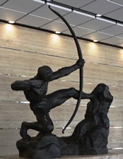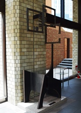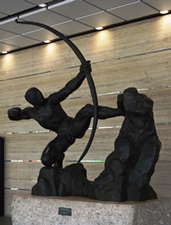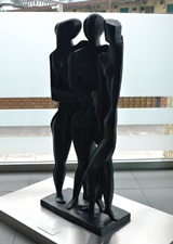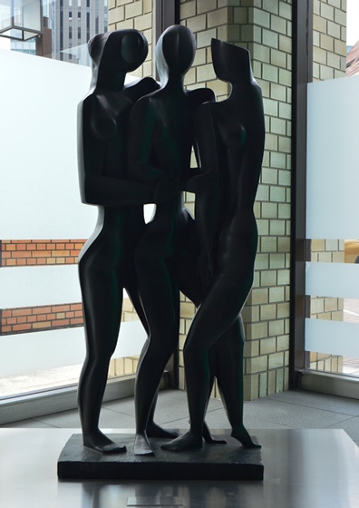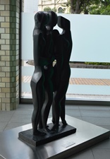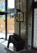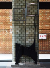 この彫刻に使われている素材は、新御茶の水ビルの骨組みの鋼材であり、台座の石は旧日販ビルの玄関の壁に使用されていた物です。新らしい鋼材と古い石の組み合わせに温故知新の心情をこらして居ります。