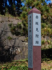 左側にある石垣は、江戸城外郭門のひとつである赤坂御門の石垣の一部です。江戸時代の門は、敵の進入を発見する施設であるため「見附」とも呼ばれ、ふたつの門が直角に配置された「枡形門」の形式をとっています。詳しい説明は、右に坂を登った角にある説明板に記されています。