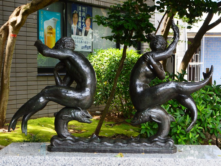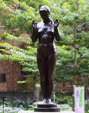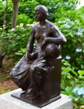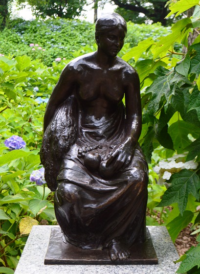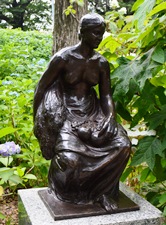 昭和5年に兜町株式取引所ビルに設置された「商業・農業・工業・交通」 (昭和63年のビル解体とともに取り壊される) のほか、兵庫県湊川公園「大楠公像」、東京赤坂の高橋公園「高橋是清翁像」が代表作としてよく知られています。小平市では、素巖の没後、遺族から寄贈された240点を越える石こう原型の保存に努めるとともに、ブロンズ鋳造を行ってきました。「齋藤素巖・彫刻の小径」は、小平駅から花小金井駅間の小平グリーンロード (狭山・境緑道) 上および隣接する公園に、16基17作品が設置されています。 このほかに、ブロンズ作品の一部は小平市役所南側の芝生広場(「荷重 (におも)」 や、ルネこだいら 中央図書館玄関壁面などに設置されています。 |