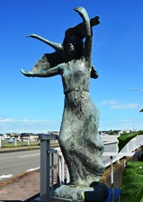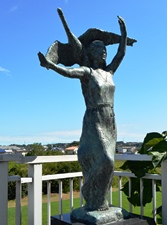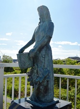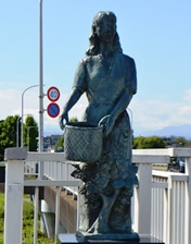 | 市の花、ヤマユリの絵柄の衣をまとい鶴とともに大空へ舞い上がる女性の像。市民公募で名付けられた「鶴巻橋」をどのような形で表したらよいかと考え、乙女と鶴の舞姿を組み合わせて衣装に市の花ヤマユリを彫った。 |