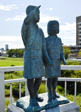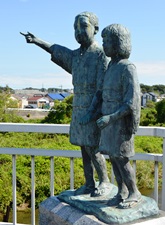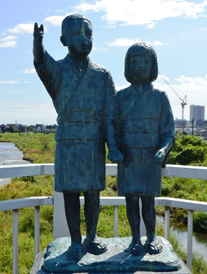 | かすりの着物を着た小さな男の子と女の子が、赤とんぼを追って夕焼け小焼けの空を眺めながら山を降り、ゆうげの我が家に帰る姿を表している。童謡作家中村雨紅(本名 高井宮吉)の故郷は八王子で、小さな男の子が指差している方向、宮尾神社境内には「夕焼け小焼けの碑」がある。 |