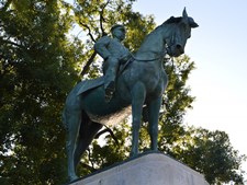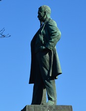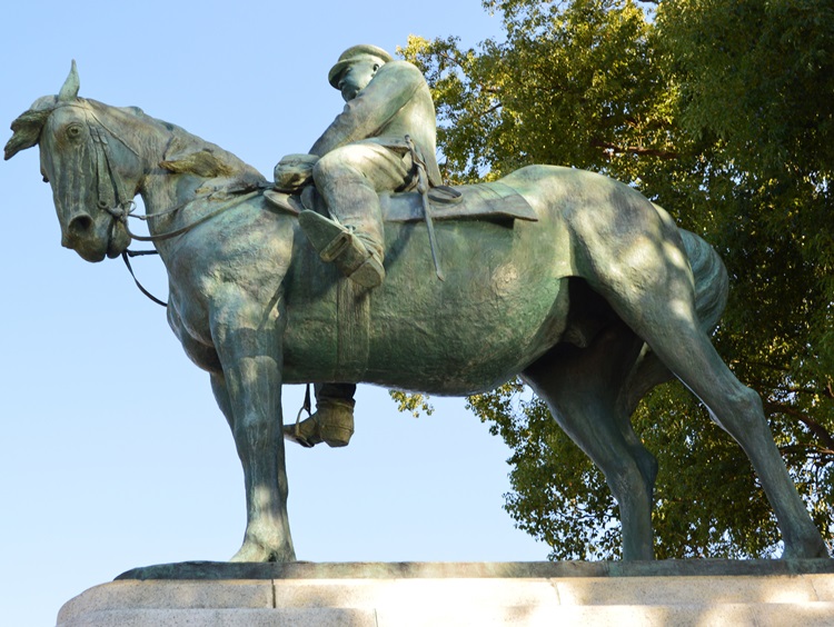 大山巌像は、大正8年(1919年)に現在の国会前庭に設置された。銅像は軍服を着た騎乗姿で、原型作者は新海竹太郎。近代の軍人像の中では、数少ない乗馬像の一つ。 昭和23年(1948年)、GHQにより一時撤去され、東京都美術館に預けられた後、昭和44年(1969年)に現在地に移転した。 |