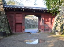 追廻門は西から和歌山城(砂の丸)に入る門で、大手門の反対側の搦手に位置します。門を出て道を隔てた外側に、馬術を練習する追廻があったので、この名がついた高麗門形式の門です。元和5年(1619年)に紀州徳川家初代頼宣が入国し、和歌山城を拡張して砂の丸や南の丸の内郭に取り込みました。当然、追廻門もその際に建立されたもので、岡口門とともに空襲でも焼けずに残った旧藩時代の数少ない遺構です。追廻門は藩主が座る二の丸御座之間の南西に位置し、陰陽道の裏鬼門にあたるので、除災のため朱色に塗られたと考えられています。 吉宗に次いで14代将軍家茂を出した紀州徳川家は、幕末には当然幕府側につきました。第二次長州戦争には先鋒隊として出陣しますが、戦費で藩財政が苦しくなり、その敗北で兵制改革の必要性を痛感します。このため藩政改革が求められ、慶応2年(1866年)に津田出を登用しました。だが翌年、保守派の反撃で津田は失脚し、急進改革派であった奥右筆組頭の田中善蔵が、追廻門で暗殺される事件が起こります。左手の石垣に近い垣根の奥にある石碑は、田中善蔵の顕彰碑です。 |