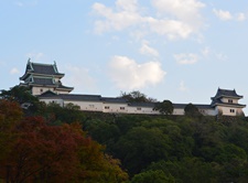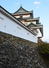 天正13年(1585年)、羽柴(豊臣)秀吉の命で弟の秀長がまず築城したのが、虎伏山の山頂部分でした。秀長は家老の桑名重晴を城代として置き、ここに天守を建てました。天守閣の一段下の北西にあった蔵が、その時の天守だとの説があります。慶長5年(1600年)、関ヶ原の戦いの後に城主となった浅野幸長は、高さ49mある西方のこの峰を「本丸」とし、黒板張りですが、ほぼ現在に近い天守閣を建てました。 元和5年(1619年)に徳川頼宣が入国すると、「天守郭」と呼ぶようになります。天守閣は大天守から時計回りに多門、天守二之御門(楠門)、二之御門櫓、多門、乾櫓、多門、御台所、小天守へと続く連立式天守です。三階建ての大天守は不定形な地盤に制約され、一階の東側と西側が二棟を結合した珍しい比翼入母屋造となっています。 寛政10年(1798年)に黒板張から白壁となりますが、弘化年(1846年)の落雷で焼失しました。天守再建は通常は許可されませんが、御三家ということで認められ嘉永年(1849年)にほぼ元のまま再建されます。ただし、楠門へ入る階段の位置が異なるなど、一部違いがありました。天守閣は昭和10年(1935年)に国宝に指定されますが、昭和20年7月9日の和歌山大空襲で焼失しました。しかし昭和33年、市民の努力で復元されたのです。 |